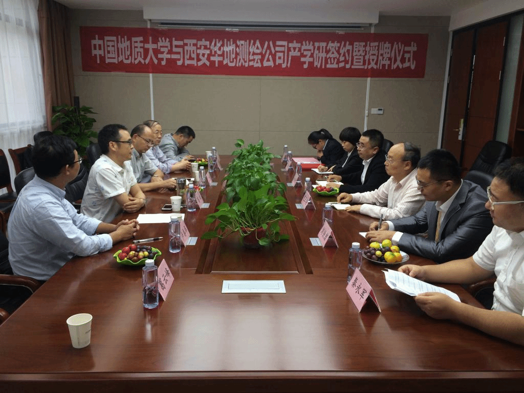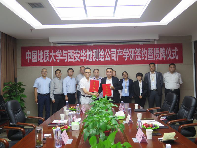 2019年9月15日-9月17日,太阳成tyc7111cc集团(武汉)太阳成tyc7111cc集团党委副书记江广长、副经理窦斌、勘察与基础工程系主任卢春华、姚爱国教授、院工会主席蔡记华教授及工程地质与岩土工程系葛云峰副教授一行赴西安,先后走访了陕西西探地质装备有限公司和西安华地测绘科技有限公司,并与陕西西探地质装备有限公司召开了产学研合作基地揭牌仪式,与西安华地测绘科技有限公司签订了产学研合作协议并进行揭牌。