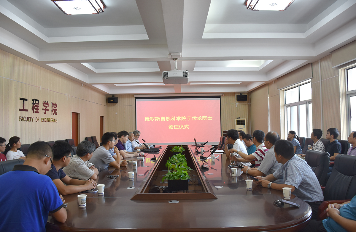 工程公司党委书记陈飞主持本次仪式。首先,经理焦玉勇教授对宁伏龙教授的主要学术成就做了简单介绍。之后,契霍特金教授向大家介绍了俄罗斯自然科学院基本情况以及外籍院士的遴选过程,并代表俄罗斯自然科公司为宁伏龙教授颁发院士荣誉证明、院士证和徽章。随后,宁伏龙教授发表荣获俄罗斯外籍院士感言,表示今后会更加致力于本职工作,积极推动与俄罗斯等国家高校、研究院所的国际合作,为公司“双一流”建设作出更多贡献。最后,王林清副书记发表讲话,对宁伏龙教授获此荣誉表示祝贺,并对宁伏龙教授及太阳成tyc7111cc集团今后的工作提出了更高的要求。
