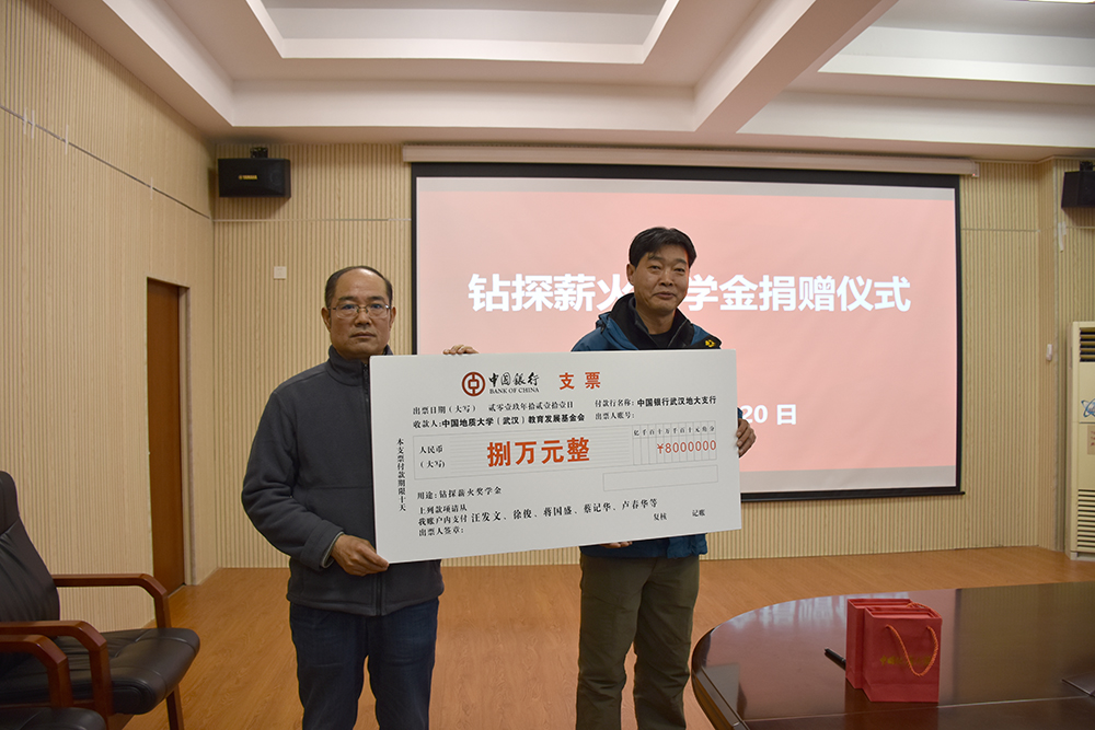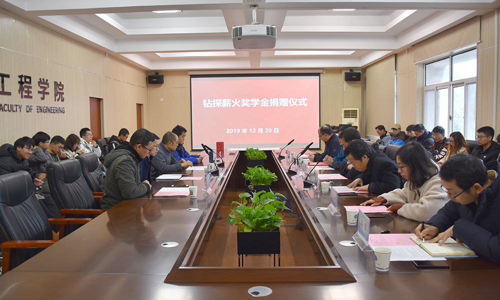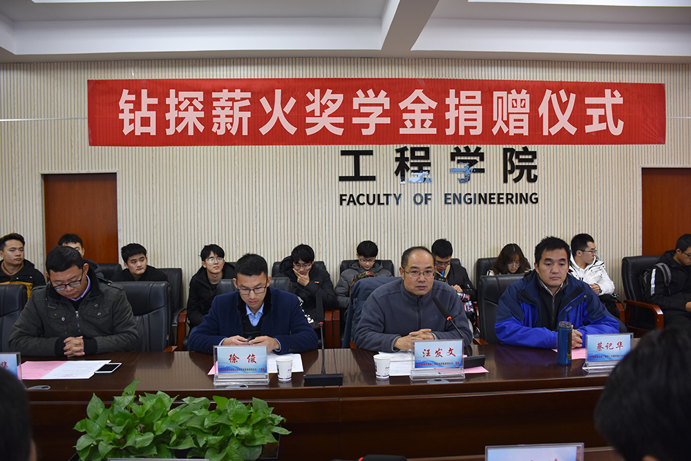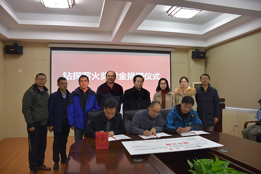 12月20日,太阳成tyc7111cc集团“钻探薪火奖学金捐赠仪式”在工程楼315会议室举行。湖北省城市地质工程院勘查部主任汪发文、副主任徐俊,员工工作与教育基金管理处副处长吕占峰,工程公司党委书记陈飞,副书记江广长,勘察与基础工程系教授段隆臣、蔡记华、卢春华及2017级部分员工代表参加捐赠仪式。