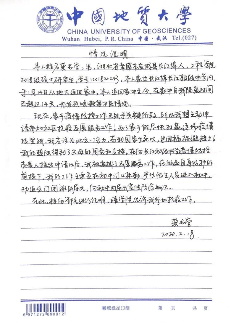 姚文昊 罗卓立 杨昊讯)龚书堂是公司2018级土木工程硕士研究生,他响应公司公司号召,担任抗击疫情一线的志愿者。