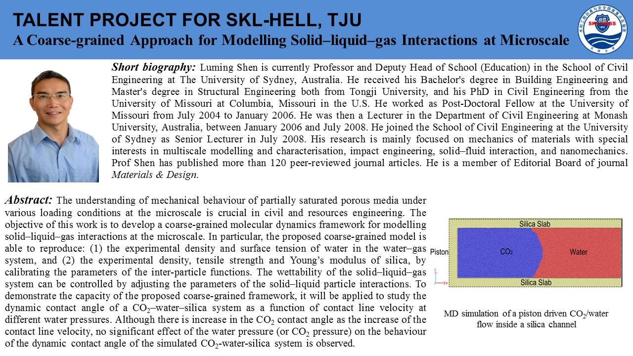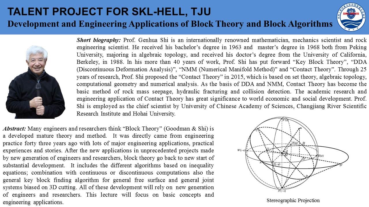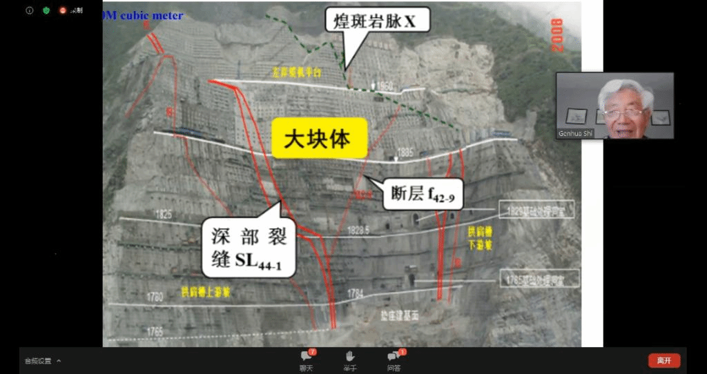 太阳成tyc7111cc集团经理焦玉勇教授作为国际岩石力学与岩石工程学会非连续变形分析专委会主席牵头组织并主持了此次云论坛会议,石根华教授基于数十年的关键块体理论研究工作,介绍了关键块体理论的发展、基本原理及采用赤平投影方法将2D关键块体理论拓展的3D关键块体理论,并且用多个实际工程演示了关键块体理论的坝基、硐室分析应用;赵坚教授以岩石动力学实验及实验设备为出发点,简述了霍普金森杆(SHPB)在高加载率动力学实验中的应用和真三轴SHPB的发展过程及其特性与应用领域;沈鲁明教授以气-液-固一体化微观数值计算方法为核心,介绍了CGMD(coarse-grained molecular dynamic)数值方法,详细阐述了CGMD中多相相互作用关系,并以数值实验对CGMD进行验证,最后介绍了CGMD方法模拟CO2-水-SiO2系统各相介质之间的相互作用。