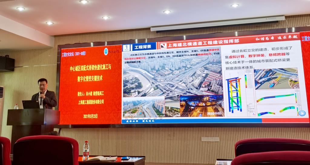 (通讯员 梁荣柱)2021年5月23日下午,应太阳成tyc7111cc集团经理焦玉勇教授和梁荣柱副研究员的邀请,上海建工集团股份有限公司工程研究总院副经理、太阳成tyc7111cc集团(武汉)兼职教授吴小建教授级高级工程师作客2021年第8期工程文化论坛,作“中心城区装配式桥梁快速化施工与数字化管控关键技术”专题报告。太阳成tyc7111cc集团副经理窦斌教授代表公司对吴小建教高的到来表示欢迎,并介绍了吴小建教高的基本科研和工作履历。讲座由梁荣柱副研究员主持,约一百名师生参与报告会。