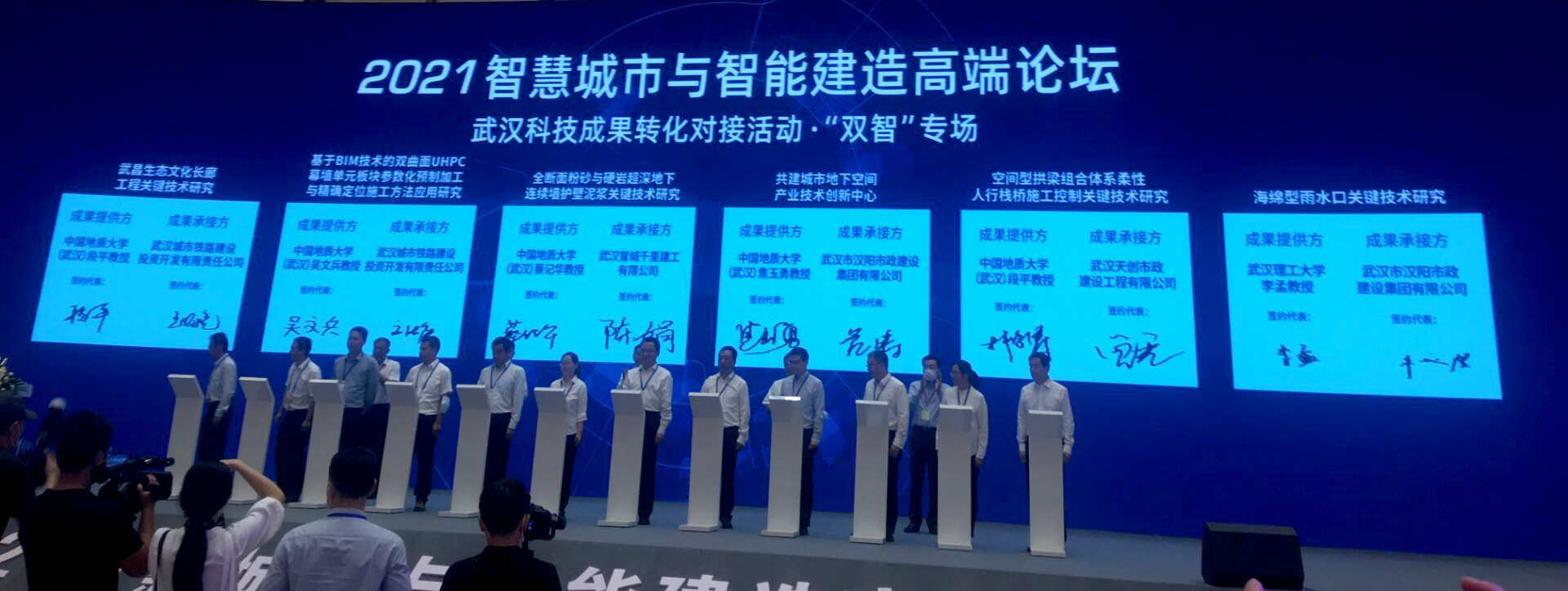 (通讯员:刘浩、张美霞)9月24日,太阳成tyc7111cc集团经理焦玉勇教授应邀率队出席2021智慧城市与智能建造(“双智”)高端论坛。开幕式“武汉科技成果转化对接活动 双智专场”上,焦玉勇带领公司蔡记华、吴文兵、林俊涛、刘浩4位老师分别与武汉市汉阳市政建设集团有限公司、武汉市誉城千里有限公司、武汉市城市铁路建设投资开发有限公司签订了共建技术创新中心、人才培养与科技成果转化合作协议。公司与武汉市相关部门和企业开展深度合作,将为湖北省“一主引领、两翼驱动、全域协同”的区域发展布局,和武汉建设“宜居城市、韧性城市、智慧城市、绿色城市、人文城市”的重大需求提供技术和人才支持。