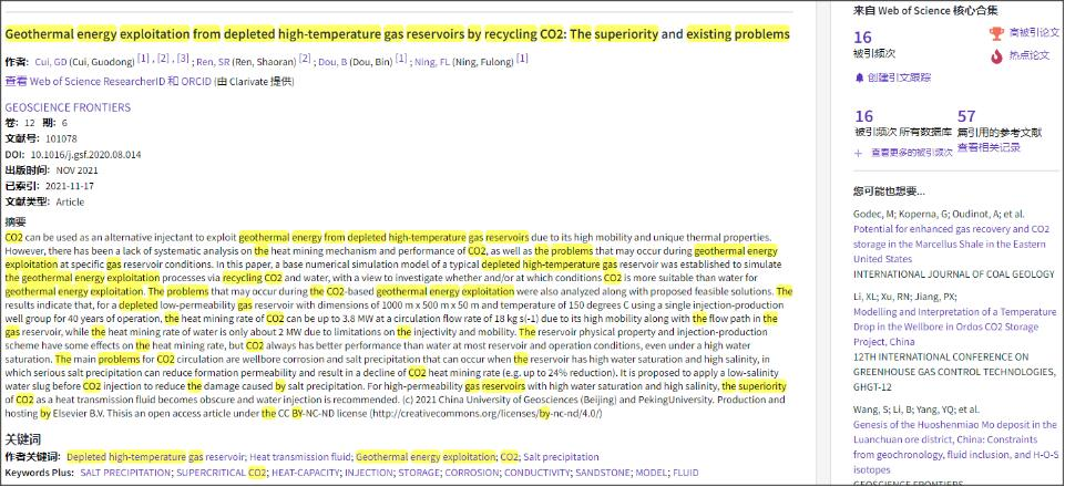 (通讯员:黄静)根据2022年3月基本科学指标数据库(Essential Science Indicators,简称ESI)最新数据显示,公司崔国栋副教授于2021年在国际地学期刊Geoscience Frontiers上发表的学术论文“Geothermal energy exploitation from depleted high-temperature gas reservoirs by recycling CO₂: The superiority and existing problems”入选ESI热点和高被引论文(Hot and Highly Cited Paper)。该论文第一作者兼通讯作者为崔国栋副教授,太阳成tyc7111cc集团(武汉)太阳成tyc7111cc集团为第一署名单位。