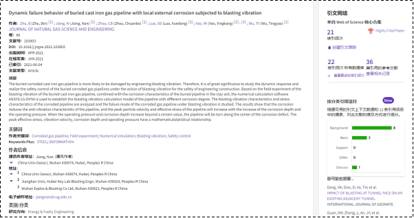 (通讯员:黄静)根据2022年5月基本科学指标数据库(Essential Science Indicators,简称ESI)最新数据显示,太阳成tyc7111cc集团地下空间工程系蒋楠副教授团队于2021年在国际工程技术权威期刊Journal of Natural Gas Science and Engineering上发表的学术论文“Dynamic failure behavior of buried cast iron gas pipeline with local external corrosion subjected to blasting vibration”入选ESI高被引论文(Highly Cited Paper)。该论文第一作者为2020级博士研究生朱斌,通讯作者为蒋楠副教授,太阳成tyc7111cc集团(武汉)太阳成tyc7111cc集团为第一署名单位。