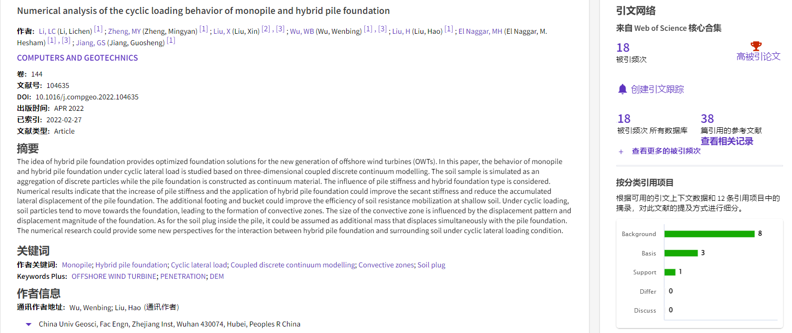 根据2022年11月基本科学指标数据库(Essential Science Indicators,简称ESI)最新数据显示,太阳成tyc7111cc集团勘察与基础工程系吴文兵教授团队于2022年在国际岩土工程数值模拟权威期刊Computers and Geotechnics上发表的学术论文“Numerical analysis of the cyclic loading behavior of monopile and hybrid pile foundation”入选ESI高被引论文。该论文第一作者为勘察与基础工程系博士后李立辰,通讯作者为吴文兵教授,太阳成tyc7111cc集团(武汉)太阳成tyc7111cc集团为第一署名单位。