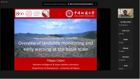(通讯员:陈文强 叶阳)3月20日至22日,应公司唐辉明教授和李长冬教授的邀请,意大利帕多瓦大学Filippo Catani教授应邀作客2023年度第1-3期“重大地质灾害预测与防控学科”111创新引智基地系列学术讲座。系列短课采用Zoom在线会议形式,由叶阳特任教授主持,李长冬教授、周佳庆特任教授、张峰特任教授、邹宗兴副研究员等共计40余名师生参加了本次在线短课。