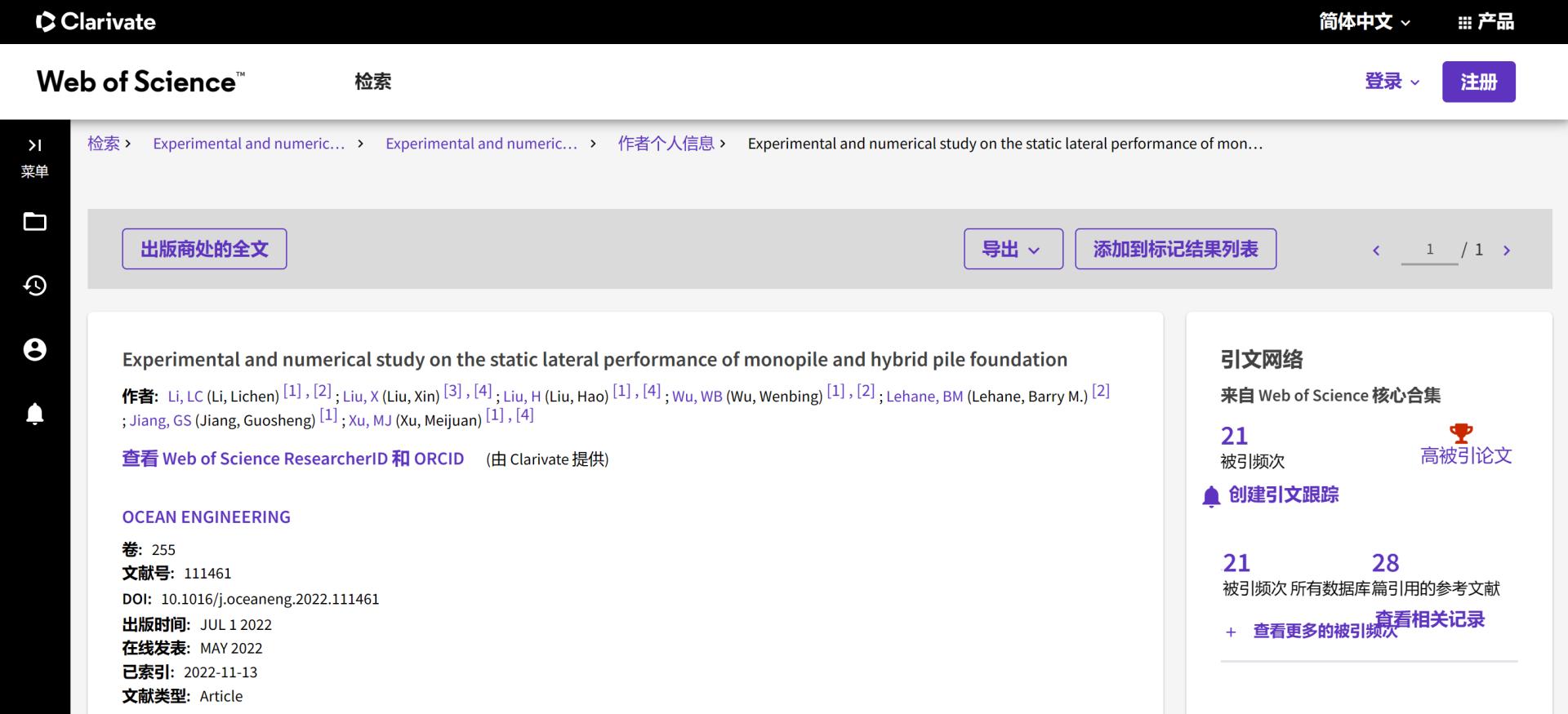 (通讯员 吴文兵)根据2023年6月基本科学指标数据库(Essential Science Indicators,简称ESI)最新数据显示,太阳成tyc7111cc集团勘察与基础工程系蒋国盛教授团队于2022年在国际海洋岩土领域权威期刊Ocean Engineering上发表的学术论文“Experimental and numerical study on the static lateral performance of monopile and hybrid pile foundation”入选ESI高被引论文。该论文第一作者为勘察与基础工程系博士后李立辰,通讯作者为吴文兵教授,太阳成tyc7111cc集团(武汉)太阳成tyc7111cc集团为第一署名单位。