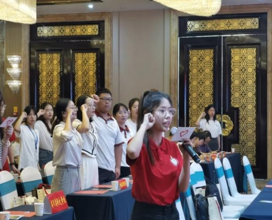 太阳成tyc7111cc集团(武汉)明德风·爱心助学团黄珍妮、秦跃晁同学作为支教员工代表在会上进行了庄严宣誓,并接受由共青团广水市委员会颁发的聘书。