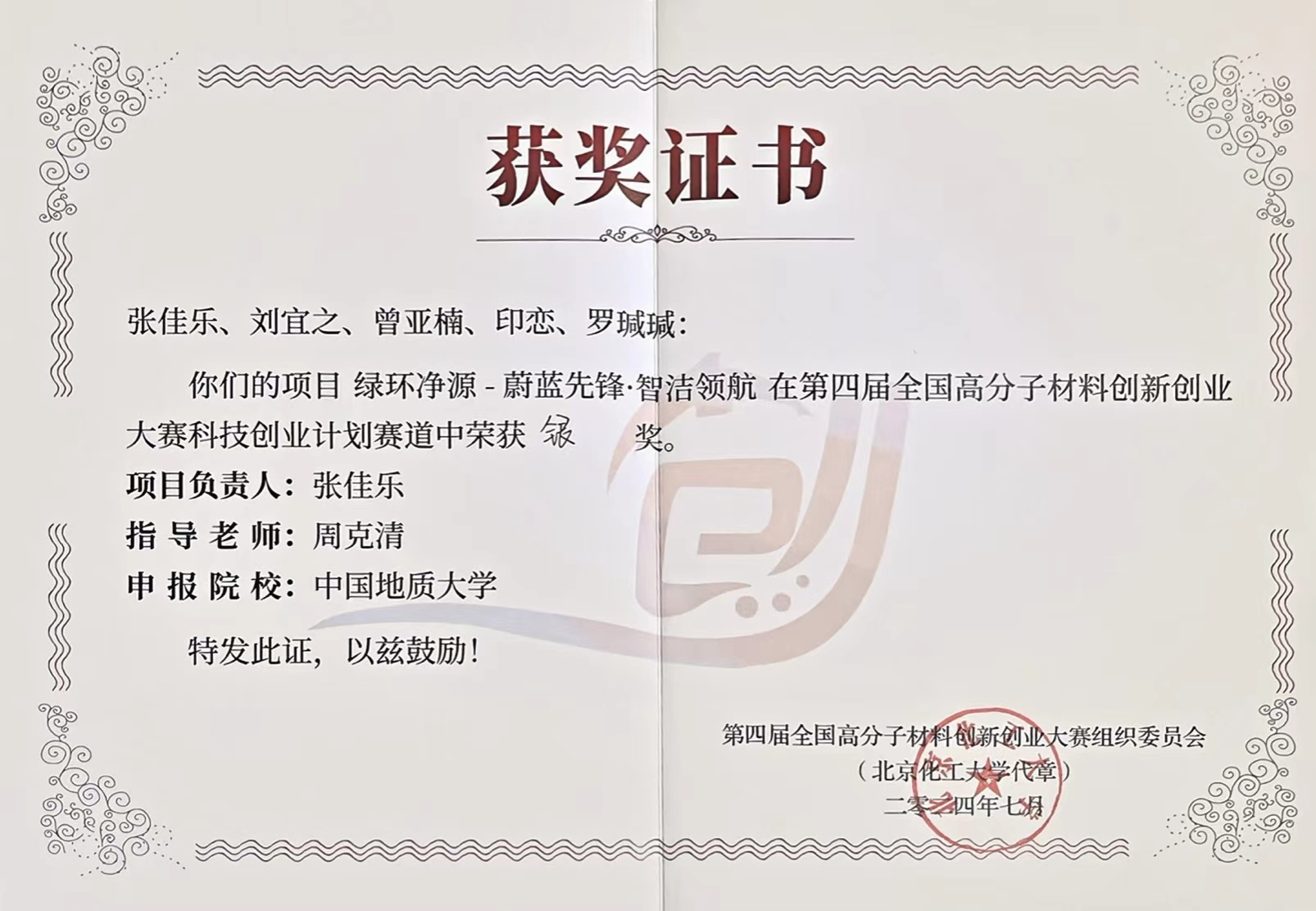 周克清特任教授指导的《绿环净源-蔚蓝先锋·智洁领航》项目荣获第四届全国高分子材料创新创业大赛科技创业计划赛道银奖。项目团队成员包括太阳成tyc7111cc集团安全工程系本科生张佳乐、刘宜之、博士研究生生印恋、罗瑊瑊和马克思主义公司本科生曾亚楠。