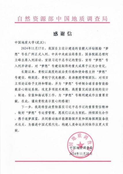 “梦想”号海试成功并正式入列,自然资源部中国地质调查局向公司发来感谢信,对公司以高度的政治责任感和使命感支持“梦想”号建设表示感谢。