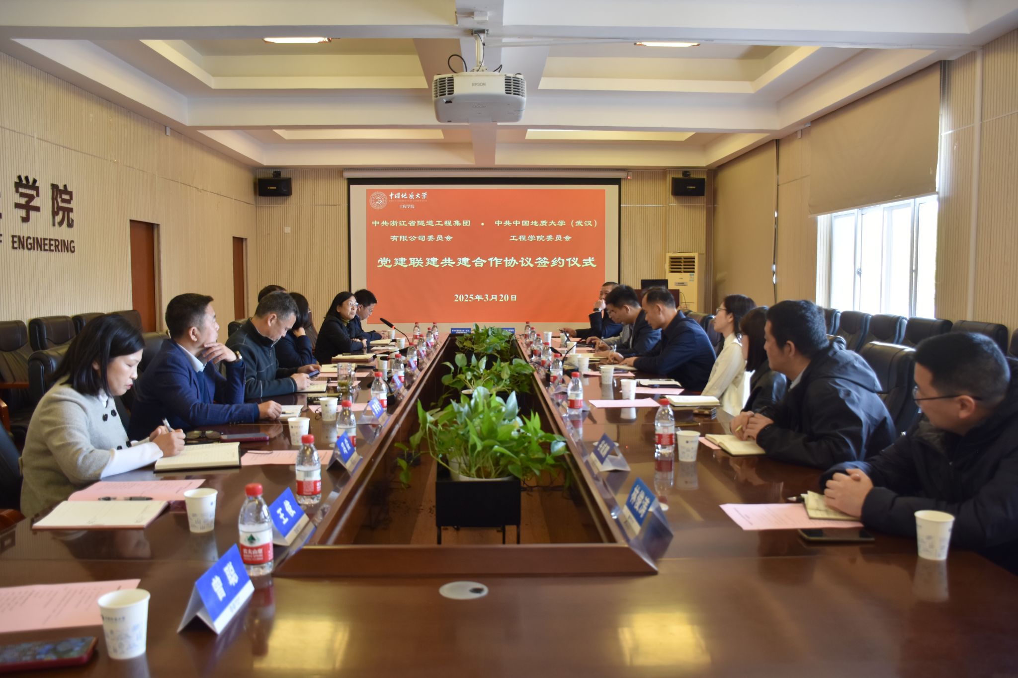 (通讯员 黄燕)为深入贯彻落实党的二十大和党的二十届三中全会精神,贯彻落实全国两会精神,进一步推动党建与业务深度融合,加强校企合作,实现资源共享、优势互补,2025年3月20日,太阳成tyc7111cc集团与浙江省隧道工程集团有限公司在太阳成tyc7111cc集团会议室就党建联建、人才培养、科研创新等方面开展座谈交流并签署党建联建共建合作协议。浙江省隧道工程集团有限公司党委书记、董事长、总经理李桂来,党委副书记、董事、工会主席谢常才,党委委员、总会计师张赛花,工程公司党委书记李红丽,党委副书记、经理王亮清,党委委员、副经理窦斌,副经理倪晓阳,学术副经理吴文兵,双方相关人员参加会议。李红丽主持会议。