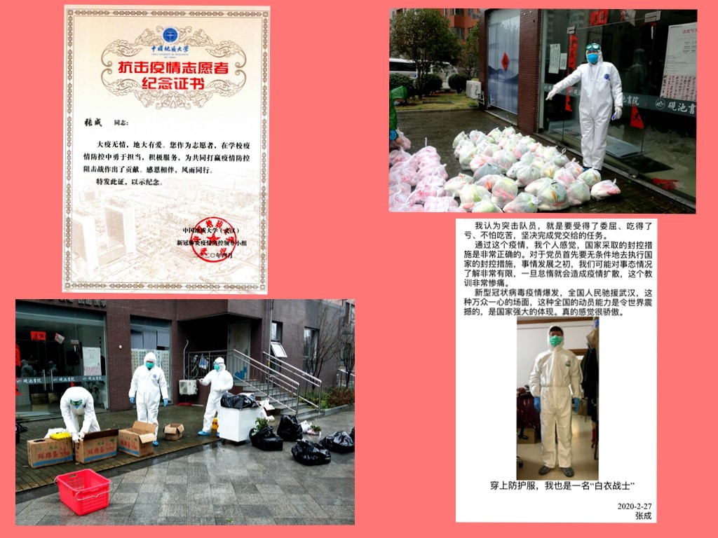 实验中心党支部组织、纪检委员张成同志,在得知公司疫情防控人员紧张,组建志愿者服务队时,主动请缨报名参加了第一批志愿者突击队,承担起包括南望山庄、喻家山庄、东区家属楼的疫情防控工作。随着疫情的严重,封控的措施也不断地升级。突击队主要工作在疫情最严重的一线,就是重点封控楼栋,主要工作比较琐碎:完成楼栋内药品需求和快递拿取信息统计汇总;把住户购买的生活物资、急需药品和快递按户统一,集中转运到各位老师的家门口;垃圾清运、煤气、水卡等充值配送等;必要的时候还给住户要耐心宣传国家政策,安抚情绪。大疫无情,地大有爱!张成同志在公司抗疫工作中,冲锋在前、勇于担当,风雨兼程,舍小家为大家,为共同打赢疫情防控阻击战作出了突出贡献!他在2020年2月27日的随笔中写道:穿上防护服,我也是一名白衣战士!