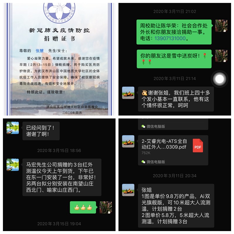 实验中心主任陈劲同志,在封城初期得知奋战在抗疫一线的医护工作者防护服紧缺,迅速通过自己的微信群发起动员,组织大家捐款捐物,共募集到价值三十多万元的善款及抗疫物资。其中,从内蒙古三众科技公司募集到的200台马桶专用净化器,在了解到武汉火神山医院暂时不能接收捐赠物资的时候,又转辗联系到黄冈市中心医院,从呼和浩特驱车1500多公里专程送达黄冈。