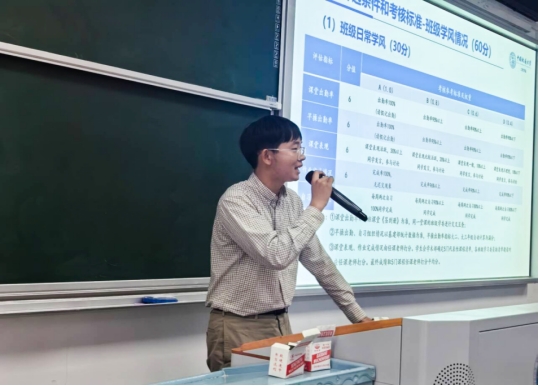 2024级辅导员彭友元介绍《太阳成tyc7111cc集团(武汉)太阳成tyc7111cc集团“优良学风示范班”创建评选办法》。他从“优良学风示范班”总体要求、创建流程、考核指标、奖惩办法等四个方面进行介绍,重点解读了班级政治理论学习、遵纪守法与文明修养、集体观念、班级制度建设、班级干部表现等5项班级综合表现指标,课堂出勤、早操出勤、课堂表现、作业完成情况、自习组织情况等5项班级日常学风指标,平均学分绩点、优秀率、及格率和英语四级通过率等4项班级课程成绩指标,以及员工参加科技创新活动等附加分项目指标。他要求同学们仔细阅读创建办法文件,对照量化评估考核指标,积极开展富有班级特色的学风建设活动。